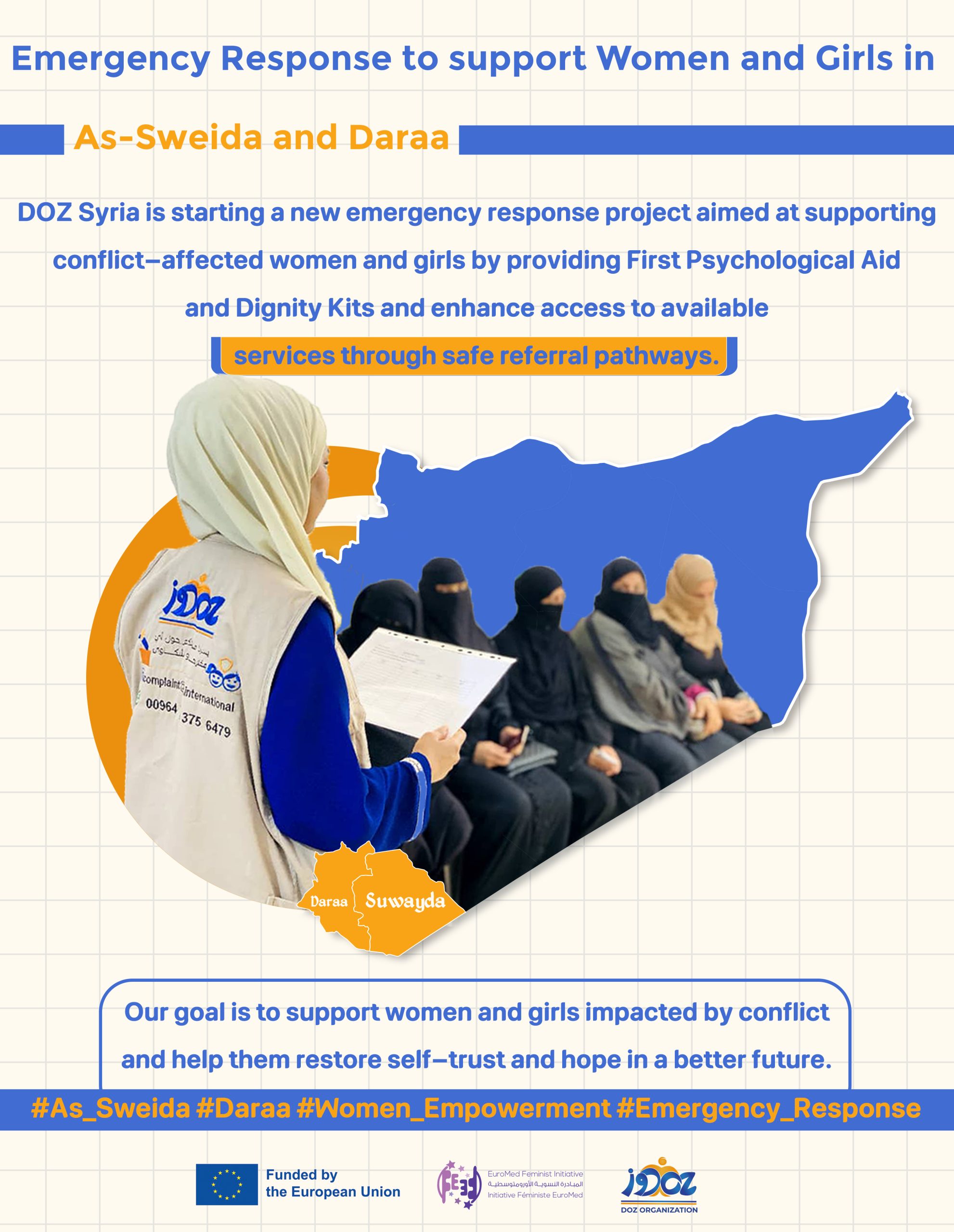 We are proud to announce the launch of our new emergency response initiative aimed at supporting conflict-affected women and girls in As-Sweida and Daraa. This project is a vital step toward restoring self-trust, resilience, and safety for those most impacted by the recent escalation in insecurity and displacement.